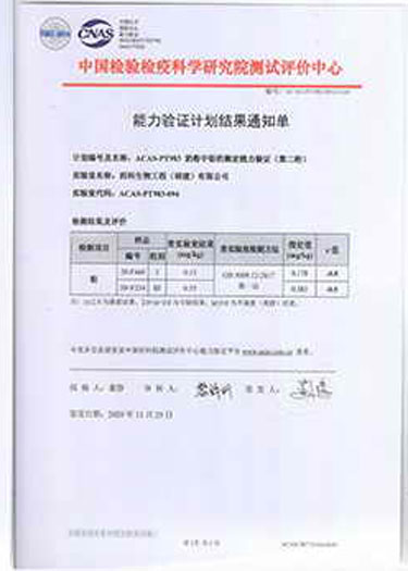 公司檢測能力通過了中國檢驗(yàn)檢疫科學(xué)研究院測試評價(jià)中心的驗(yàn)證