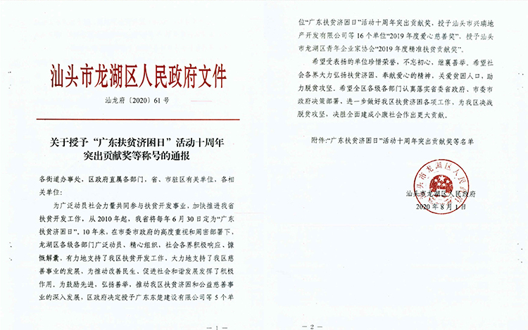 ????? 2020年6月獲得汕頭市龍湖區(qū)慈善總會(huì)頒發(fā)的“熱心公益 樂(lè)善好施”榮譽(yù)證書(shū),2020年8月獲得汕頭市龍湖區(qū)人民政府授予的“2019年度愛(ài)心慈善獎(jiǎng)”。