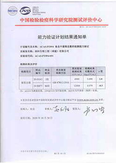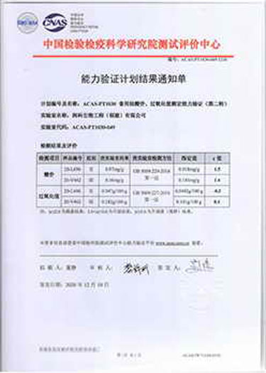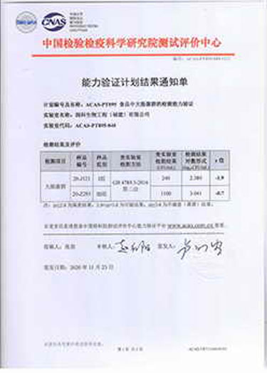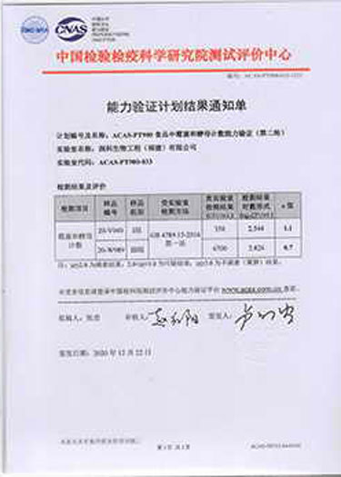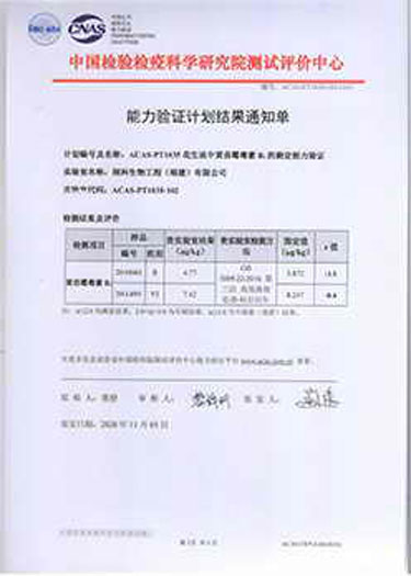 ? ? ? ?潤科生物中心實(shí)驗(yàn)室檢測水平不斷提升,積極參加中國檢驗(yàn)檢疫科學(xué)研究院測試評價(jià)中心開展的能力驗(yàn)證計(jì)劃,累計(jì)已參與了菌落總數(shù)、黃曲霉毒素B1、鉛、大腸菌群、酸價(jià)、過氧化值、霉菌和酵母計(jì)數(shù)等多項(xiàng)指標(biāo)檢測能力驗(yàn)證,驗(yàn)證評價(jià)結(jié)果均為滿意。