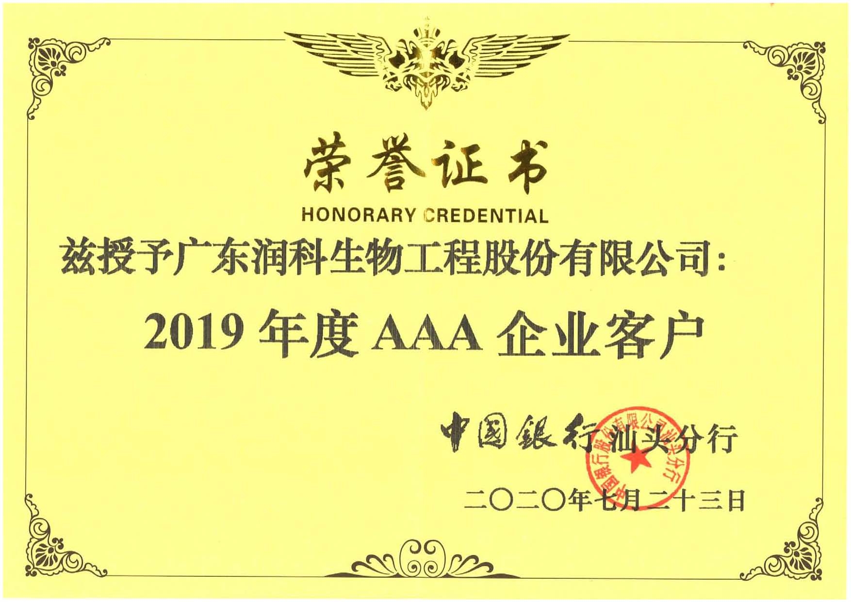 公司榮獲中國(guó)銀行授予2019年度AAA企業(yè)客戶(hù)證書(shū)